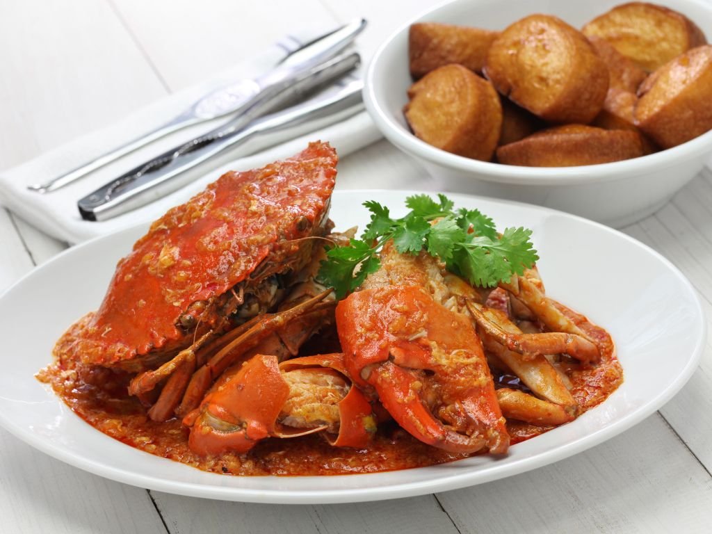 Mud crab in a tomato-chilli-egg gravy that is sweet, spicy, and thick enough to demand mantou — fried buns — for mopping. This is not hawker food in the traditional sense, but no list of Singapore dishes is complete without it.