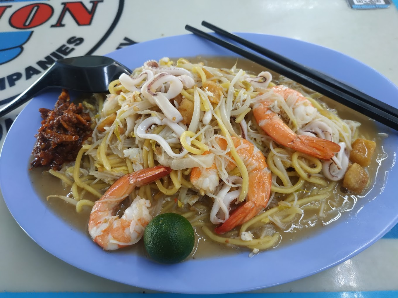 Yellow egg noodles and white rice noodles stir-fried together in a rich prawn-and-pork broth, finished with sambal, bean sprouts, and calamansi. The Singapore version is different from Penang's — wetter, brothier, more umami. Do not compare them.