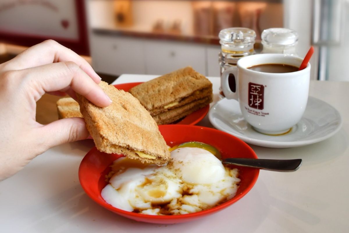 Charcoal-grilled thin bread, cold butter, kaya — a slow-cooked coconut and pandan jam. Eaten with soft-boiled eggs seasoned with dark soy and white pepper, and a cup of kopi. This is the Singapore breakfast set.